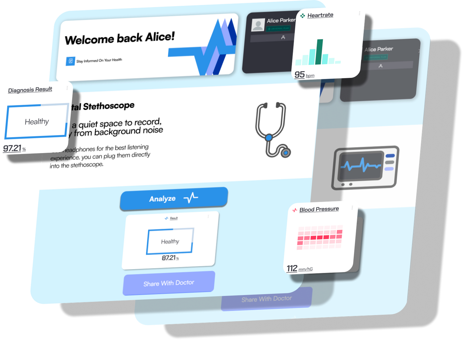 StethoAI revolutionizes health monitoring by integrating AI in the detection of heart murmurs and beyond. Our pending multi-device approach, encompassing a digital stethoscope, a BP monitor, and more devices to come, empowers you to track your health with unparalleled precision. With us, managing health is proactive, patient-centered, and accurate—heralding a new era for medical analysis